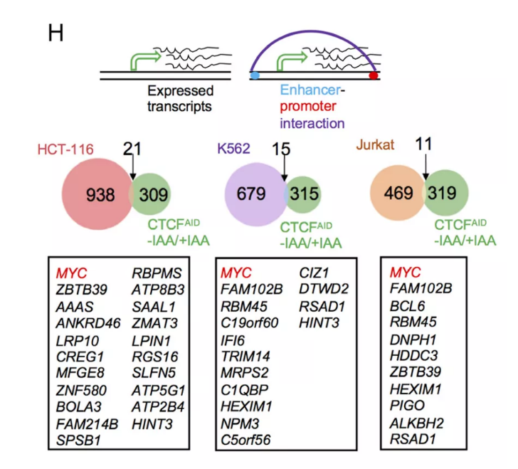 CTCF基因啟動子的染色質可及性在CTCF耗竭時也有所增加(圖3D),這一點通過定量PCR (Q-PCR)進一步得到驗證(圖3E)。這些數(shù)據(jù)表明CTCF可以抑制自身以保持最*表達水平。對于CTCF耗竭后被下調的基因,如MYC,并沒有在啟動子區(qū)域檢測到有統(tǒng)計學意義的染色質可及性變化。因此,當啟動子區(qū)域保持開放時,遠端增強子區(qū)域的染色質景觀變得更難以接近,再加上CTCF耗竭,可能在控制能調控MYC轉錄的遠端增強子-啟動子loop環(huán)的形成中發(fā)揮作用。