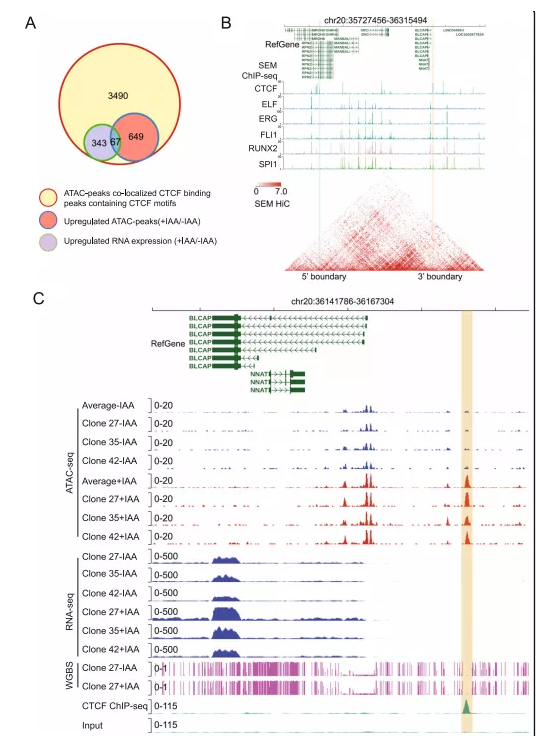 本文通過綜合分析建立了一個框架來識別假定的CTCF介導的絕緣子元件。將ATAC-seq結果中的3490個峰和有CTCF結合的峰取交集,共有716個增強的ATAC-seq峰。接下來,將它們與RNA-seq結果中上調的基因進行比對,判斷TSSs是否位于距離DARs區(qū)域2-50 kb的范圍。綜上所述,有67個基因符合這些標準(圖(Fig 4A)。這67個基因中有20個基因的附近有染色質loop環(huán)。例如,在BLCAP基因上游約7 kb處觀察到一個假定的抑制性CTCF結合峰,該峰位于Hi-C數(shù)據(jù)所示的染色質絕緣loop環(huán)中(圖4B )。在未經(jīng)過IAA處理的對照CTCFAID細胞中,CTCF與該motif結合導致染色質可及性受到抑制,這在ATAC-seq數(shù)據(jù)中信號的缺失很明顯。然而,在急性CTCF耗竭時,ATAC-seq峰值信號和BLCAP mRNA表達明顯增加(圖4C)。