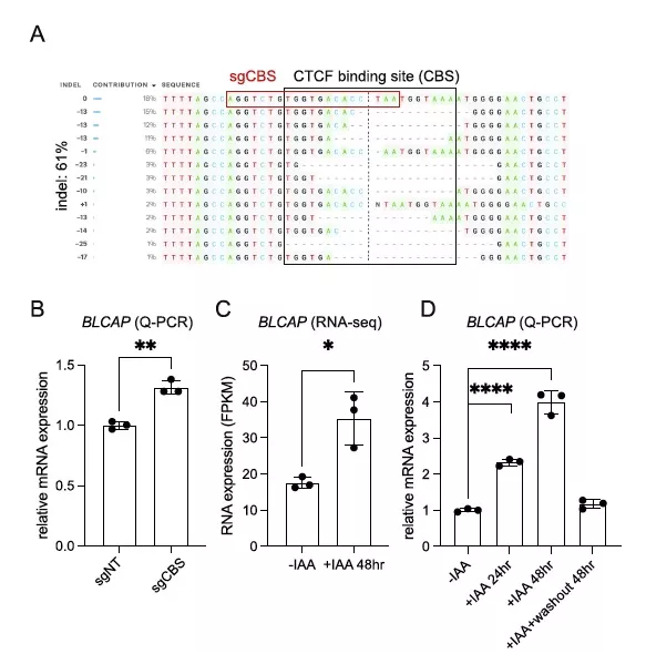 為了進一步驗證預測的假定絕緣子的作用,將慢病毒表達的引導RNA感染表達Cas9的SEM細胞中,然后進行抗生素選擇。Sanger基因組測序(Inference of CRISPR edit, ICE)在目標人群中檢測到約61%的總indel頻率(圖5A),與非靶向導向對照組(sgNT)相比,導致BLCAP mRNA表達顯著增加(圖5B)。用IAA處理CTCFAID細胞24和48小時,然后洗脫IAA進行CTCF修復。通過RNA-seq分析和Q-PCR驗證,驗證急性CTCF蛋白耗竭時BLCAP mRNA的表達(圖5C)。不出所料,生長素處理24或48 h后CTCF蛋白急性耗竭,BLCAP表達水平顯著升高。更重要的是,洗脫生長素后,其表達水平恢復到親本細胞的水平(圖5D)。綜上所述,這些數(shù)據(jù)有力地支持了CTCF在BLCAP調控區(qū)域的占用充當了控制BLCAP表達的功能絕緣體。