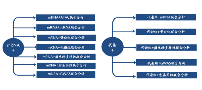 以上就是轉(zhuǎn)錄組和代謝組聯(lián)合分析的主要內(nèi)容,由于生物過(guò)程具有復(fù)雜性和整體性,多種物質(zhì)共同影響生命系統(tǒng)的表型和性狀,例如環(huán)境、基因、mRNA、調(diào)控因子、蛋白、代謝等,這些組學(xué)之間,既相互獨(dú)立,又互相影響,既有很大的差別,又有相似之處。多種多樣的組學(xué)聯(lián)合分析將不同層面之間信息進(jìn)行整合,從不同的組學(xué)角度共同探究生物體內(nèi)潛在的調(diào)控網(wǎng)絡(luò)機(jī)制,深層次理解各個(gè)分子之間的調(diào)控及因果關(guān)系,從而更深入的認(rèn)識(shí)生物進(jìn)程和疾病過(guò)程中復(fù)雜性狀的分子機(jī)理和遺傳基礎(chǔ),后續(xù)我們還將推出其他常見(jiàn)的組學(xué)聯(lián)合分析內(nèi)容的介紹,敬請(qǐng)期待。
