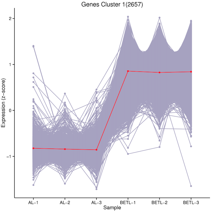 將各個(gè)分組對(duì)差異代謝物和差異基因分別用Kmeans進(jìn)行分類,然后按分類進(jìn)行繪圖,可找到變化趨勢(shì)一致代謝物和基因,這些趨勢(shì)一致代謝物和基因之間可能存在一定的關(guān)系,為研究提供了一定的方向。