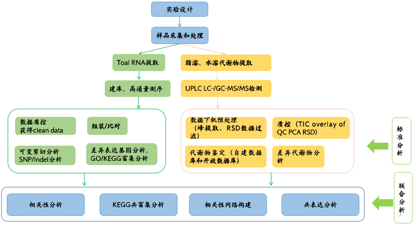 代謝與轉(zhuǎn)錄組聯(lián)合分析是基于兩個(gè)組學(xué)各自的標(biāo)準(zhǔn)分析結(jié)果,將差異代謝物和差異基因在代謝通路上的注釋結(jié)果進(jìn)行關(guān)聯(lián)分析,可以在代謝通路上更好地解釋轉(zhuǎn)錄調(diào)控機(jī)制。常規(guī)的聯(lián)合分析內(nèi)容主要包括代謝組和轉(zhuǎn)錄組KEGG通路分析、KEGG共富集分析、相關(guān)性分析、差異基因和差異代謝物趨勢(shì)分析、典型相關(guān)性分析、限制性對(duì)應(yīng)分析等內(nèi)容。