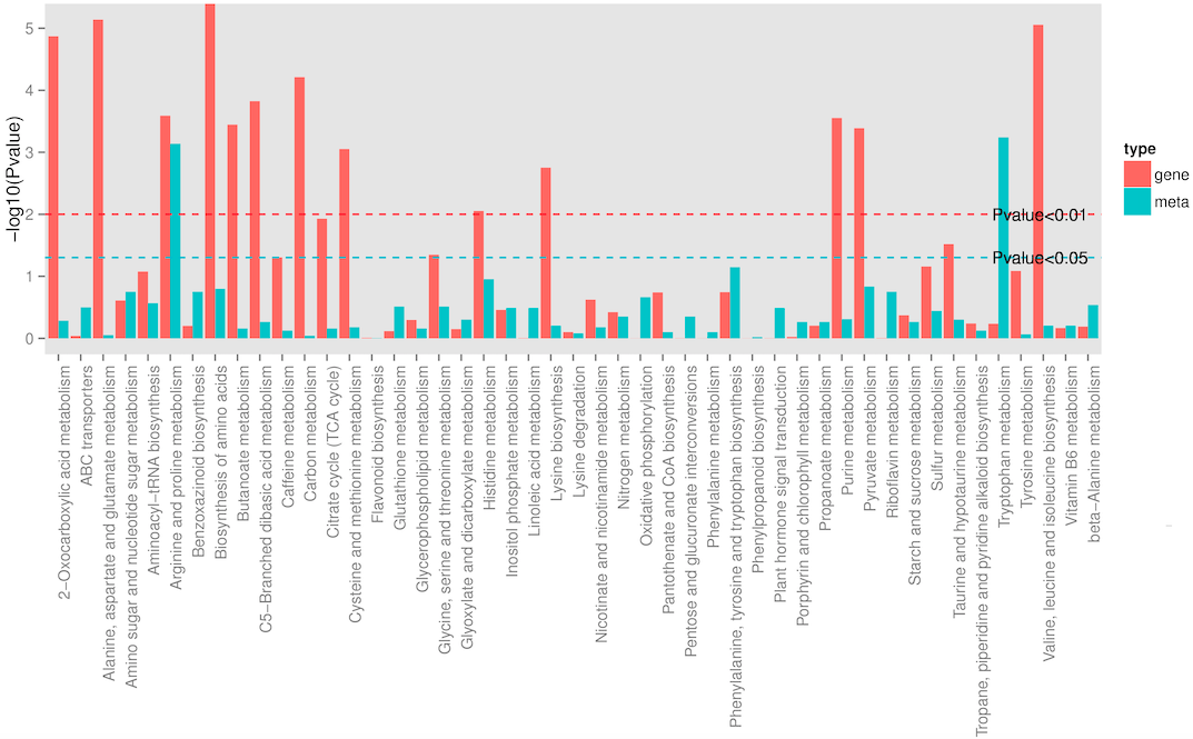 轉(zhuǎn)錄組測(cè)序可以得到大量差異基因、眾多調(diào)控網(wǎng)絡(luò)。難以確定關(guān)鍵途徑,也無(wú)法鑒定控制關(guān)鍵途徑的結(jié)構(gòu),而代謝物是生命活動(dòng)最終的體現(xiàn)者,表型性狀的微小變化在代謝水平會(huì)呈指數(shù)放大,可以利用代謝組來(lái)反映表型的狀態(tài)變化,但是單獨(dú)代謝組檢測(cè),無(wú)法解釋影響表型的基因機(jī)理。轉(zhuǎn)錄本水平的基因變化是否真的是決定表型變化的關(guān)鍵基因?這個(gè)問(wèn)題需要通過(guò)轉(zhuǎn)錄組和代謝組的聯(lián)合分析進(jìn)行回答。