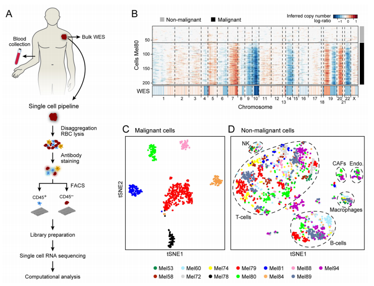 2016年發(fā)表在science(IF=47.728)上的《Dissecting the multicellular ecosystem of metastatic melanoma by single-cell RNA-seq》[2],使用多步驟方法根據(jù)遺傳和轉(zhuǎn)錄狀態(tài)來(lái)區(qū)分黑色素瘤中的不同細(xì)胞類型。首先通過(guò)對(duì)各染色體上100個(gè)基因片段的表達(dá)進(jìn)行平均,從表達(dá)譜中推斷出大規(guī)??截悢?shù)變異(CNV)。其次,根據(jù)細(xì)胞的表達(dá)譜對(duì)細(xì)胞進(jìn)行分群,結(jié)合CNV分析,發(fā)現(xiàn)惡性細(xì)胞形成一個(gè)單獨(dú)的簇,表明高度的腫瘤間異質(zhì)性。相比之下,按細(xì)胞類型聚集的非惡性細(xì)胞分別被注釋為T細(xì)胞、B細(xì)胞、巨噬細(xì)胞、內(nèi)皮細(xì)胞、癌癥相關(guān)成纖維細(xì)胞(CAF)和NK細(xì)胞。針對(duì)惡性細(xì)胞,該研究后期進(jìn)行細(xì)胞周期分析,篩選處于高分類狀態(tài)的細(xì)胞,查看它們的分子表達(dá)情況;對(duì)于非惡性細(xì)胞,該研究主要討論了其與黑色素瘤微環(huán)境的相互作用。
