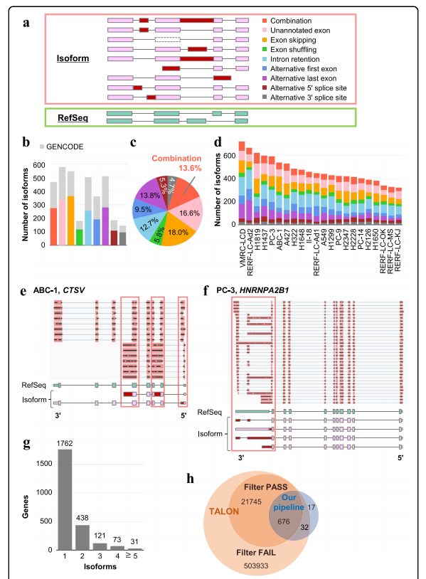文章鑒定了轉(zhuǎn)錄異構(gòu)體的完整外顯子-內(nèi)含子結(jié)構(gòu),并將其分為以下類型:未標(biāo)記外顯子、外顯子跳躍、互斥外顯子、內(nèi)含子保留、5’可變外顯子和3’可變外顯子(圖 1a)。因此,文章從所有細(xì)胞系中鑒定出3474種非RefSeq亞型,并將它們命名為假定的“異常剪接亞型”,以下簡稱為“亞型”,2021種亞型包含至少一個(gè)在參考序列或基因代碼數(shù)據(jù)集中沒有出現(xiàn)的剪接事件(圖1b)。還在單個(gè)全長轉(zhuǎn)錄本上鑒定了這些剪接事件的新組合,這很難通過短reads測序數(shù)據(jù)的片段reads檢測到。