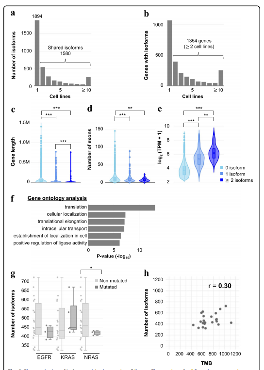 為了表明富含同種亞型的基因,作者比較了有或無的同種亞型基因長度、外顯子數(shù)量和表達(dá)水平。與不含同種亞型的基因相比,含有至少一種同亞型的基因顯示出更短的序列長度,并且由較少數(shù)量的外顯子組成;然而,發(fā)現(xiàn)含有同種亞型的基因的表達(dá)水平明顯升高。作者還發(fā)現(xiàn),同種亞型的多樣性與基因長度和表達(dá)水平有關(guān)。具有一種同種亞型的細(xì)胞系的基因顯示了具有兩種或多種同種亞型在基因長度和表達(dá)水平上的顯著差異。例如,在VMRC-LCD中,富含同種亞型的基因往往比只有一種同亞型的基因長度更短,表達(dá)量更高(圖2c–e)。