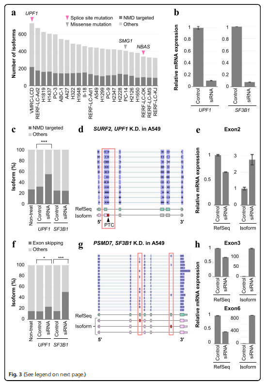 SF3B1是一種眾所周知的剪接因子,在多種疾病中發(fā)生突變,并導(dǎo)致異常剪接亞型的增加。作者通過SF3B1敲除評估剪接損傷的影響以及研究剪接因子的畸變是否影響轉(zhuǎn)錄本的產(chǎn)生。作者發(fā)現(xiàn)外顯子跳躍的比例顯著增加(圖3f),例如,PSMD7的外顯子3和6 在敲除后被改變(圖3g)。SF3B1-depleted的A549細(xì)胞中,外顯子跳躍亞型的表達(dá)PSMD7在中顯著增加,相反,RefSeq類型減少。為了確認(rèn)剪接位點(diǎn)近端區(qū)域的共有序列,作者收集了僅在SF3B1在A549細(xì)胞中敲除檢測到的外顯子跳躍異構(gòu)體。在這項(xiàng)分析中,作者用新的剪接連接的10 bp的區(qū)域,并跳過了外顯子。具有外顯子跳躍亞型的基因在翻譯和泛素-蛋白酶體途徑中顯示出顯著的富集,因此,這些因素的中斷可能會改變至少一些異常剪接亞型,并可能導(dǎo)致它們在肺癌細(xì)胞中的積累。