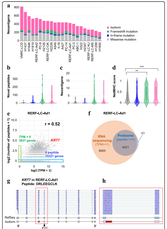 為了從實(shí)驗(yàn)上驗(yàn)證異常的轉(zhuǎn)錄本是否被翻譯成蛋白質(zhì),對11種細(xì)胞系(A427、A549、H1650、H2228、II-18、PC-9、RERF-LC-Ad1、RERF-LC-Ad2、RERF-LC-KJ、RERF-LC-MS和VMRC-LCD)采用了使用液相色譜結(jié)合串聯(lián)質(zhì)譜(LC/MS/MS)對于多肽識別,作者基于每個(gè)細(xì)胞系的MinION數(shù)據(jù)定制了肽序列數(shù)據(jù)庫。如前所述,普通轉(zhuǎn)錄組測序由于其測序能力,顯示出比LC/MS/MS蛋白質(zhì)組學(xué)更高的基因覆蓋率。通過液相色譜/質(zhì)譜/蛋白質(zhì)組學(xué)檢測的每個(gè)基因的肽數(shù)與通過轉(zhuǎn)錄組測序數(shù)據(jù)計(jì)算的TPM相關(guān)(r= 0.52,圖4e)而且LC/MS/MS蛋白質(zhì)組學(xué)檢測到的大部分基因也被轉(zhuǎn)錄組測序覆蓋(圖4f)。作者成功地檢測到7個(gè)翻譯自異常剪接亞型特異性區(qū)域的多肽。例如,衍生自外顯子3中具有選擇性5’剪接的轉(zhuǎn)錄本的多肽KRT7存在于RERF-LC-Ad1(圖4g)。在GENCODE數(shù)據(jù)庫中沒有發(fā)現(xiàn)這種轉(zhuǎn)錄本,但是在ENST00000547613中觀察到了這種同中型特異性連接,其被認(rèn)為是處理過的轉(zhuǎn)錄本。MinION也證實(shí)了在H1437、H2126和II-18中的表達(dá)(表1).此外,這種轉(zhuǎn)錄本有可能產(chǎn)生幾個(gè)新抗原,這些新抗原是由NetMHC預(yù)測的。這些結(jié)果表明,一些異常剪接亞型被真正翻譯成肽,并可能在癌癥中產(chǎn)生新抗原中發(fā)揮作用。