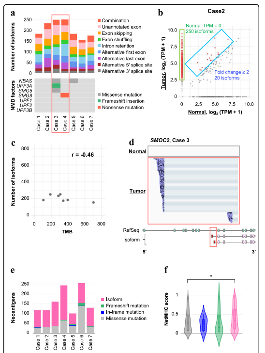 為了檢查體內(nèi)癌細(xì)胞中是否也存在異常剪接轉(zhuǎn)錄本,作者接下來分析了臨床肺癌標(biāo)本。應(yīng)用與臨床樣本細(xì)胞系分析相同的分析方案,能夠識別每個(gè)患者的異常剪接亞型(圖5a)。作者選擇了在腫瘤樣本中表達(dá)水平比非腫瘤樣本高至少兩倍的轉(zhuǎn)錄本(圖5b)在所有臨床樣本中鑒定出982種富含癌癥的剪接亞型。其中,448種亞型在參考序列或基因代碼。異常亞型的數(shù)量和TMB之間沒有顯著的相關(guān)性(圖5c)。作為檢測到的轉(zhuǎn)錄本的一個(gè)例子,在SMOC2如圖1所示5d和僅在病例3的腫瘤中表達(dá)。類似于細(xì)胞系分析的結(jié)果,作者可以識別獨(dú)立剪接事件的幾種獨(dú)特組合模式,這些模式占這些未標(biāo)記亞型的14.5%。還確定了保留在癌細(xì)胞中的潛在的NMD靶向亞型,這表明NMD機(jī)制在相應(yīng)的癌癥中被破壞。值得注意的是,在病例3和4中,發(fā)現(xiàn)*大數(shù)量的潛在NMD靶向亞型在關(guān)鍵NMD因子中存在移碼或無義突變,UPF3B和SMG8(圖5a)。