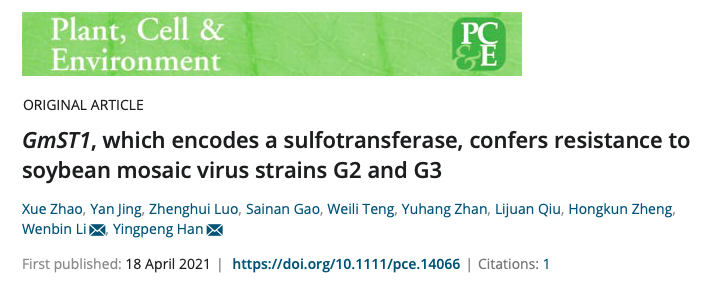 [2] Zhao X, Jing Y, Luo Z, et al. GmST1, which encodes a sulfotransferase, confers resistance to soybean mosaic virus strains G2 and G3. Plant Cell Environ. 2021 Aug;44(8):2777-2792.