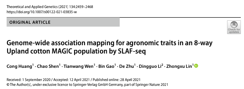 [10] Huang C, Shen C, Wen T, et al. Genome-wide association mapping for agronomic traits in an 8-way Upland cotton MAGIC population by SLAF-seq. Theor Appl Genet. 2021 Aug;134(8):2459-2468.