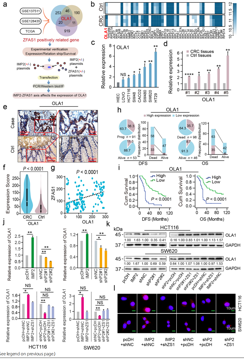 隨后采用TMA和IHC檢測(cè)OLA1的表達(dá)(圖4e),通過(guò)RCO曲線評(píng)估OLA1的低/高表達(dá),發(fā)現(xiàn)與對(duì)照組相比,CRC組織中觀察到明顯的OLA1表達(dá),表現(xiàn)出致癌基因的特性(圖4e,f)。且OLA1與ZFAS1的表達(dá)存在正相關(guān)性(圖4g)。與臨床數(shù)據(jù)做相關(guān)性分析,結(jié)果表明OLA1低表達(dá)的患者占比較高(圖4h),OLA1高表達(dá)的CRC患者的DFS和OS時(shí)間明顯縮短了(圖4i)。后續(xù)針對(duì)OLA1是否是ZFAS1的下游靶點(diǎn)做驗(yàn)證,IMP2沉默/過(guò)表達(dá)不僅降低/增加了OLA1 mRNA的表達(dá),而且降低/增加了OLA1蛋白的表達(dá)。但是IMP2對(duì)OLA1的影響可以被ZFAS2完全逆轉(zhuǎn)(圖4j-l)。