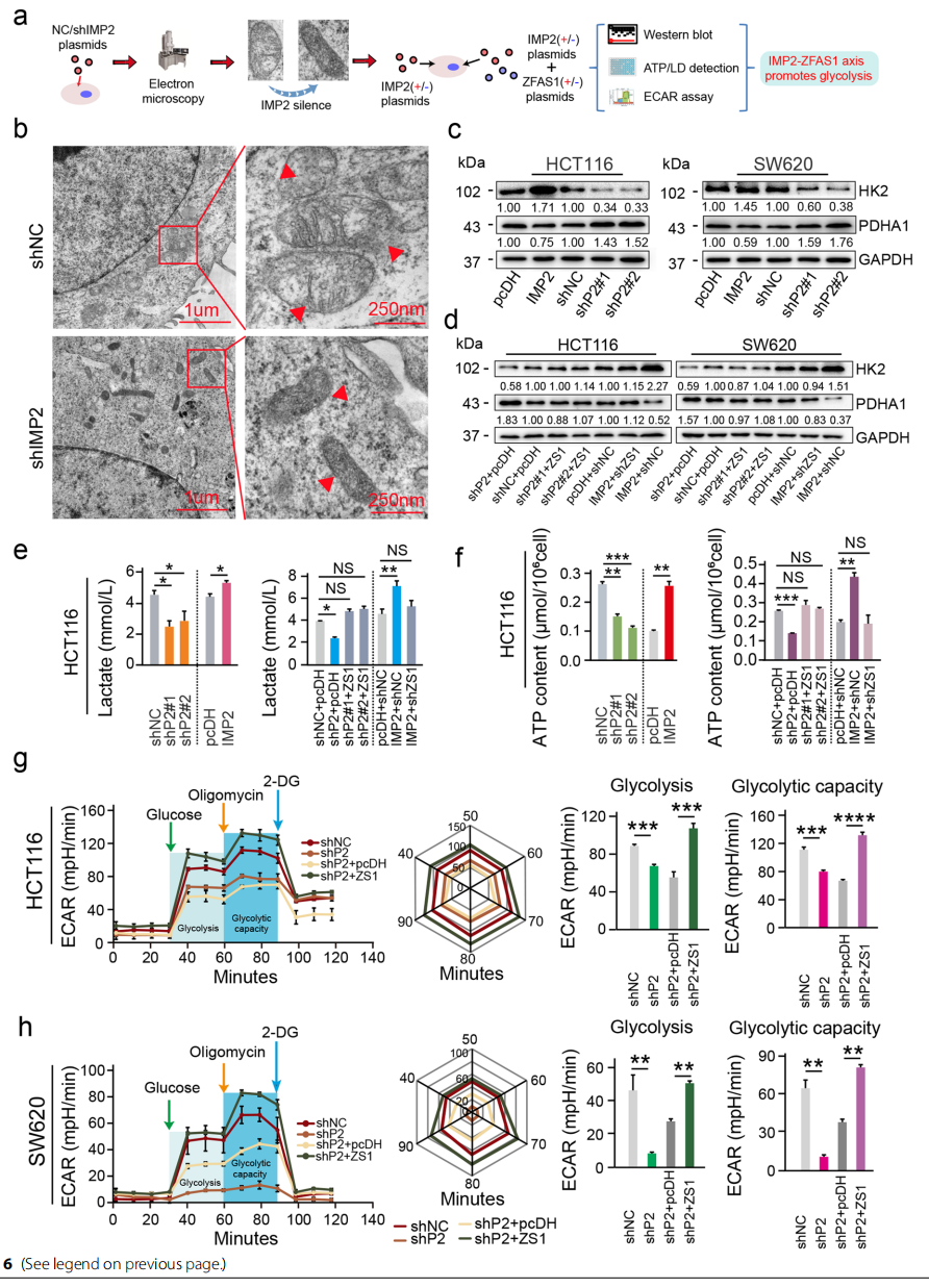 通過(guò)電子顯微鏡觀察到IMP2沉默后線粒體形態(tài)發(fā)生變化,即發(fā)現(xiàn)CRC細(xì)胞中線粒體明顯腫脹和受損,IMP2沉默后線粒體的形態(tài)回復(fù)正常(圖6b)。同時(shí)IMP2的過(guò)度表達(dá)促進(jìn)了HK2(糖酵解的關(guān)鍵蛋白)的表達(dá),抑制了PDHA1(氧化磷酸化的關(guān)鍵蛋白)的表達(dá)(圖6c)。然而ZFAS1沉默/過(guò)度表達(dá)和IMP2過(guò)表達(dá)/沉默后,HK2和PDHA1的表達(dá)水平得到恢復(fù)(圖6d)。