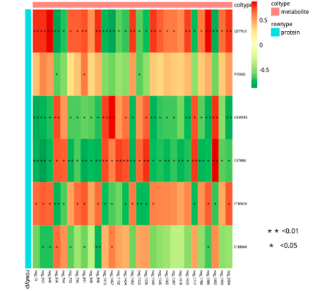 為進(jìn)一步展示多組組學(xué)之間的相關(guān)性,對(duì)基因、蛋白、代謝物之間進(jìn)行相關(guān)性分析,并繪制相關(guān)性熱圖,直觀的展示出哪些分子間的相關(guān)性更高。