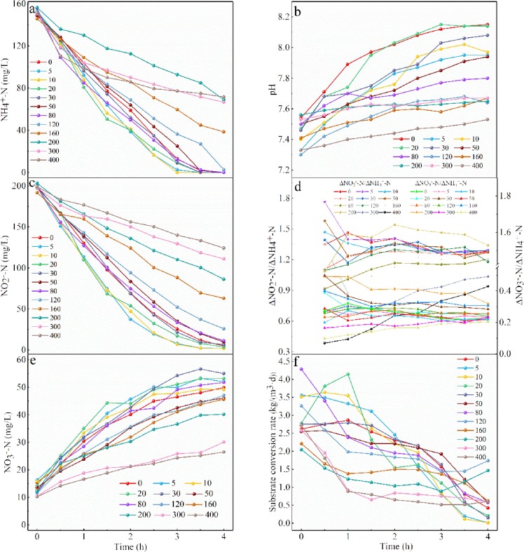 如圖3d所示,ΔNO2–N/ΔNH4+-N 和ΔNO3–N/ΔNH4+-N在前2小時出現(xiàn)不規(guī)則波動,然后趨于穩(wěn)定。然而,在300-400 mg/L時,ΔNO2–N/ΔNH4+-N顯著偏離1.32,這與0-50 mg/L時的情況相反。隨著磷酸鹽濃度的增加,出水pH升高的幅度逐漸變平(圖3b),例如400 mg/L時,ΔpH值僅占不添加磷酸鹽時的33%。如圖3f所示,隨著反應(yīng)時間的延長,底物轉(zhuǎn)化率逐漸降低,在160-400 mg/L階段,由于磷酸鹽沉積物的存在,底物與生物質(zhì)之間的接觸受到阻礙,導(dǎo)致底物轉(zhuǎn)化率較低。因此,在高濃度磷酸鹽的存在下,SBR 中MAB的活性會嚴(yán)重惡化。