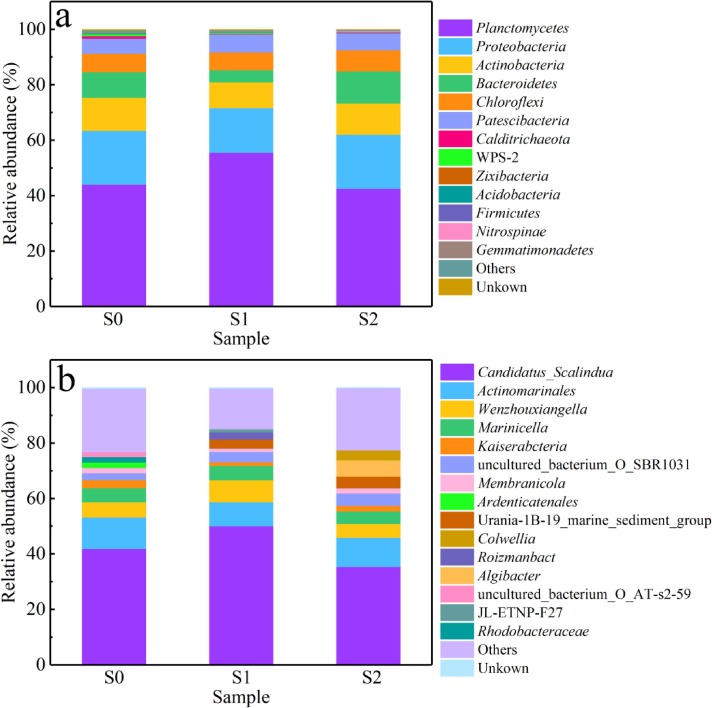 通過16S rRNA研究了不同磷酸鹽濃度下SBR中微生物群落的變化。三個時間的微生物樣品的OTU數(shù)量分別為311、300和297,圖4a揭示了SBR中的主要微生物:Planctomycetes、Proteobacteria、Actinobacteria、Bacteroidetes和Chloroflexi。其中,含有厭氧氨氧化菌屬的Planctomycetes仍處于優(yōu)勢地位,添加磷酸鹽后,S1中的Planctomycetes從初始的44.11%加至55.6%,然后在S2中下降至42.61%,屬水平上同樣。此外,Proteobacteria、Actinobacteria、Bacteroidetes和Chloroflexi的豐富度均由S0的19.36%、11.95%、9.3%和6.53%下降到S1的16.09%、9.31%、4.38%和6.37%,然后上升到S2的19.53%、11.18%、11.59% 和 7.68%。這表明上述4個門與Planctomycetes存在競爭關(guān)系,且Planctomycetes是含鹽廢水中的優(yōu)勢菌種。