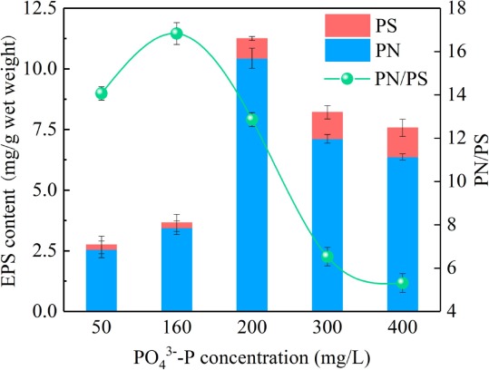 圖6.不同磷酸鹽劑量下EPS含量的變化 PN:蛋白質(zhì) PS:多糖