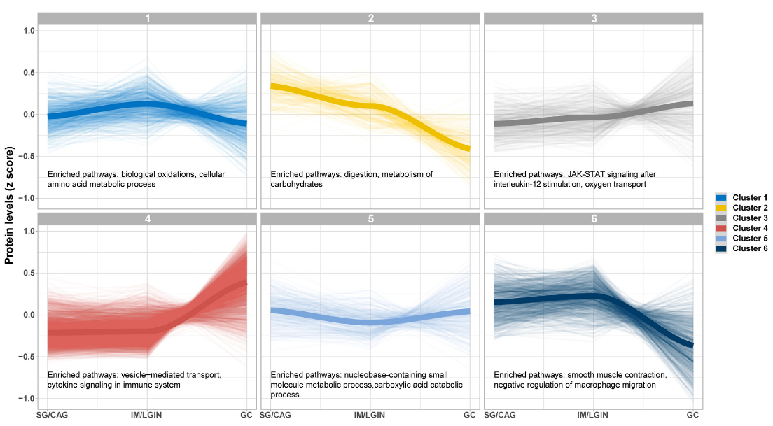 對三個預(yù)選定的受試者組進(jìn)行了蛋白質(zhì)組學(xué)數(shù)據(jù)的無監(jiān)督聚類分析:即輕度胃病變 (SG/CAG)、晚期胃病變 (IM/LGIN) 和胃癌(GC),揭示了從胃病變到 GC的不同特征。然后沿著胃病變進(jìn)展的級聯(lián)探索了詳細(xì)的蛋白質(zhì)表達(dá)模式,并提取了 6 個具有相似軌跡的蛋白質(zhì)簇,展示了蛋白質(zhì)組學(xué)譜的從輕度胃病變、晚期胃病變至GC的動態(tài)變化。