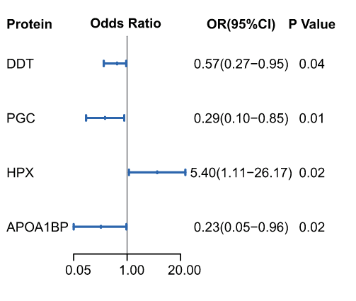 通過對驗證集中受試者的前瞻性隨訪,考查了上文詳述的217種蛋白質(zhì)與胃病變進(jìn)展風(fēng)險之間的關(guān)聯(lián)。其中的四種蛋白質(zhì),即 APOA1BP、PGC、HPX 和 DDT,進(jìn)一步與胃病變進(jìn)展風(fēng)險和隨訪終點發(fā)生IM或更嚴(yán)重胃病變的風(fēng)險顯示出相關(guān)(P < 0.05,邏輯回歸分析)。HPX與早期GC和胃病變進(jìn)展呈正相關(guān),而 APOA1BP、PGC 和 DDT 呈負(fù)相關(guān)。這四種突出顯示的蛋白質(zhì)分別聚集在蛋白簇-2 (PGC)、-4 (HPX)、-5 (APOA1BP) 和 -6 (DDT) 中。
