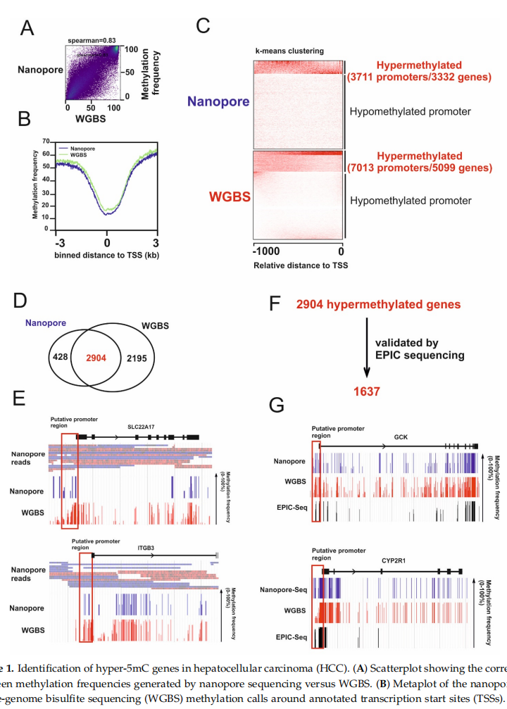 通過應(yīng)用納米孔測序技術(shù)對HCC基因組中高度可信的5-甲基胞嘧啶信號進行了分析,并確定了具有生物學意義的腫瘤抑制基因候選者,這些候選基因在 HCC 中被表觀遺傳沉默。這項工作導(dǎo)致在HCC中發(fā)現(xiàn)和表征一種作為腫瘤抑制基因的基因,并為未來的分析提供了多種候選基因。數(shù)據(jù)表明納米孔測序產(chǎn)生的甲基化信號與 WGBS 相關(guān)性良好。還表明這項技術(shù)能夠?qū)?mC與胞嘧啶的其他修飾區(qū)分開來,例如5hmC(羥甲基化)。這說明納米孔測序是適用于鑒定高甲基化TSG的方法。總之,這些數(shù)據(jù)為進一步研究人類癌癥的腫瘤發(fā)生過程提供了有價值的線索。