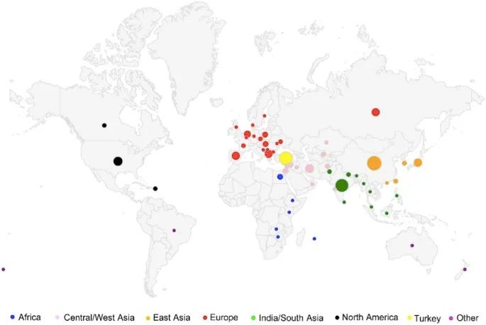 2021年8月發(fā)表在《PNAS》上的“10,038份辣椒群體基因組分析”,調查了野生和馴化辣椒的基因組多樣性和種群結構,追溯了進化路線,并提供了一個反映人類貿易和歷史/文化影響的辣椒傳播模型。本結果突出了西-東擴張路線,揭示了南美洲和中美洲、非洲以及東亞/南亞之間的聯(lián)系,后兩者構成了辣椒多樣性的重要多樣化中心。最后,文章提出了種質資源庫管理的思路和未來種質資源開發(fā)利用的方向。