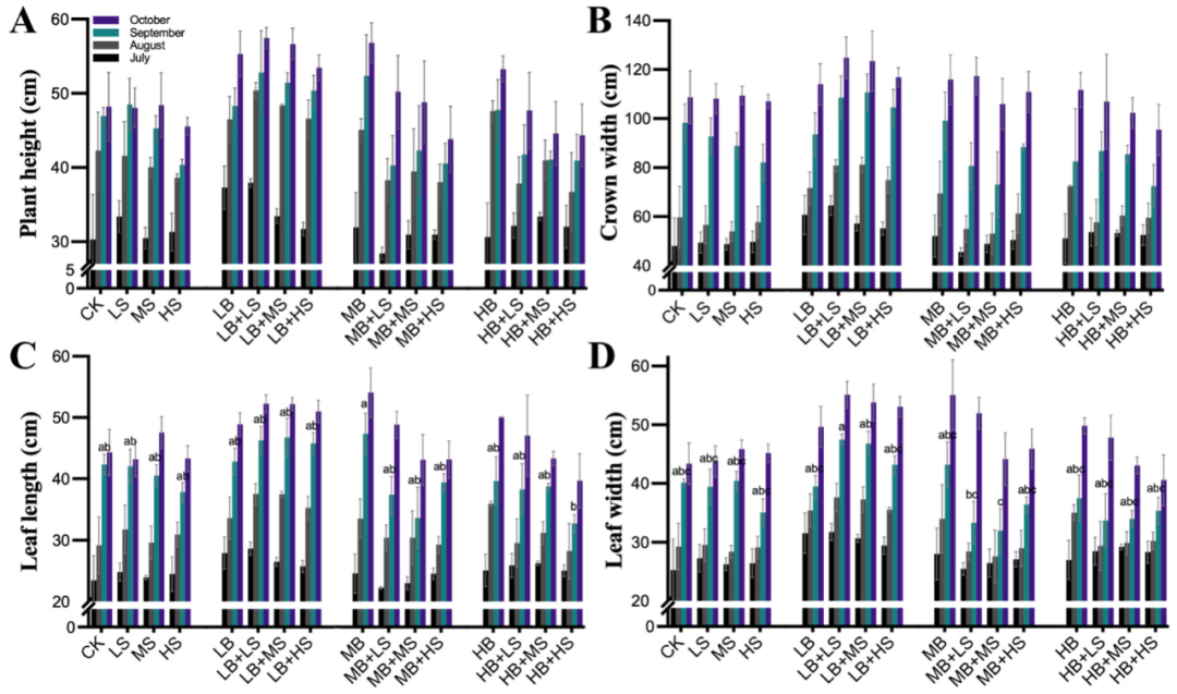 R. palmatum?L.在不同生長時期(7、8、9、10月)的生長參數(shù)如圖1所示。與對照組(CK)相比,任意三種濃度的細菌接種劑(LB、MB和HB)處理后的株高、冠寬、葉長和葉寬都有所增加。我們的結果顯示了兩個明顯的倒V形趨勢,在四種含 LB 的處理(LB、LB + LS、LB + MS和LB + HS)中出現(xiàn)了一個外峰。盡管HB處理增加了R. palmatum?L.的生長,但當與蔗糖結合時,它降低了生長,尤其是在 HB + HS 處理下。這表明用高水平蔗糖(15 g/L)修正的高水平細菌接種劑(1.0 ×?107CFU/mL)抑制了PGPM的植物促生長功能。