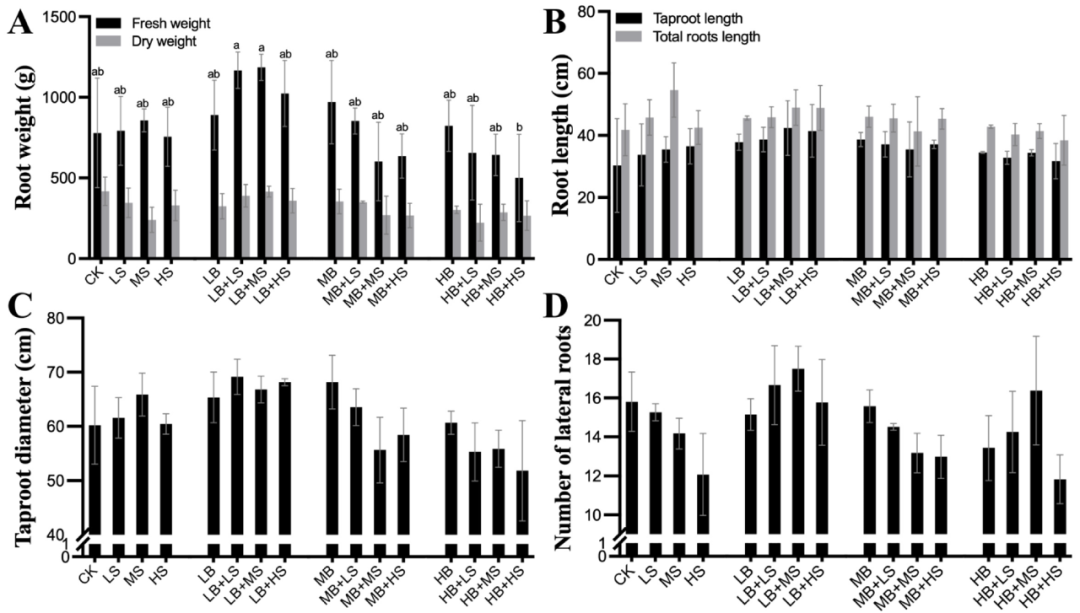 在收獲時,還確定了地塊產量的變化(圖2)。與兩個明顯的倒V形趨勢的生長結果一致,LB + LS和LB + MS處理下的R. palmatum?L.根的鮮重得到了最顯著的改善(圖2A)。我們進一步分析了主根和側根的變化(圖2B-D),發(fā)現(xiàn)在LB+MS下獲得最大的根長和側根數(shù),而在LB+LS下獲得最大的主根直徑,這意味著 LB + MS處理刺激側根的數(shù)量和長度,而LB + LS促進主根厚度以提高R. palmatum?L.的根重。