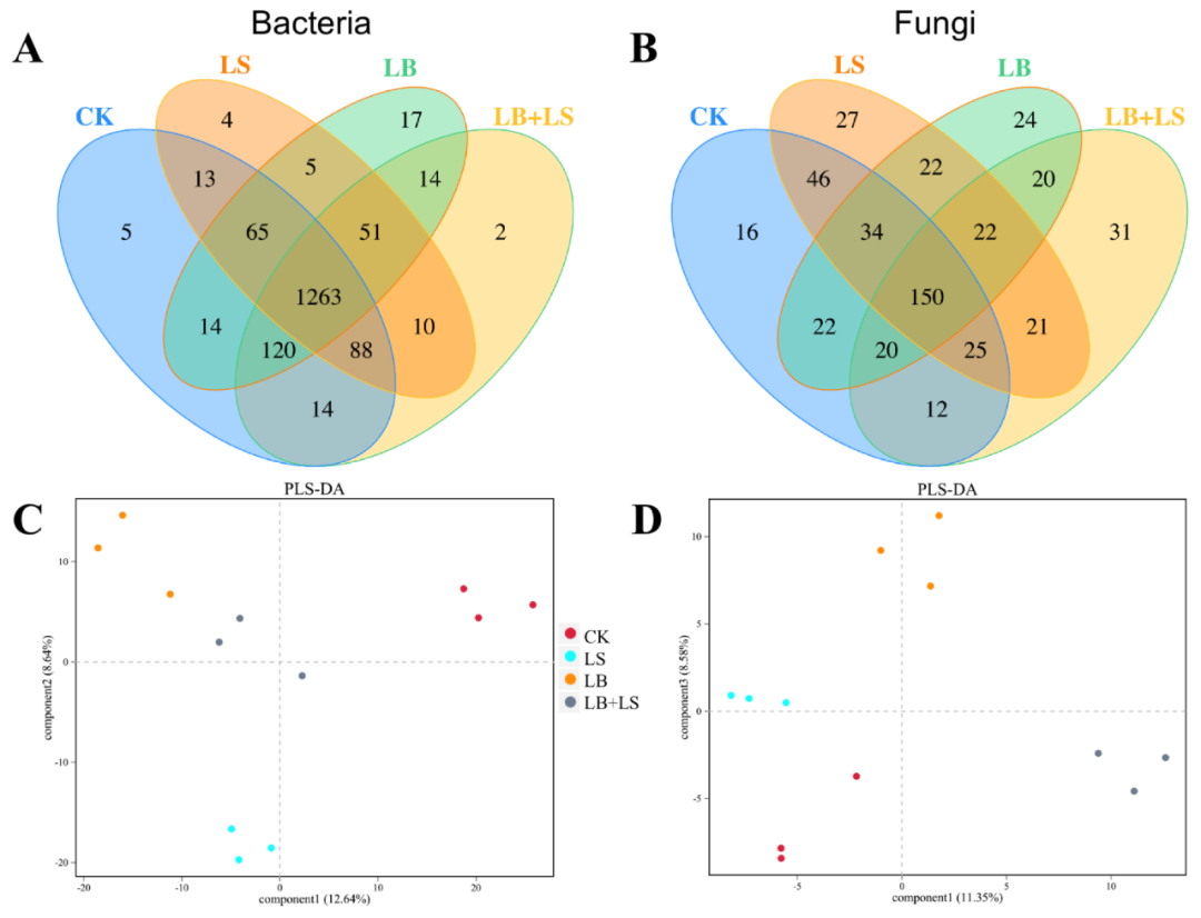 生成了基于16S rRNA 基因的細菌測序和基于ITS rRNA 基因的真菌測序圖譜,以更好地揭示大黃根際的微生物群落組成。使用 97%的核苷酸序列同一性,將這些序列分為1685個細菌OTU和492個真菌OTU,其中CK根際細菌OTU豐度最高(1582),其次是LB + LS(1562)、LB(1549)、和LS (1499)處理,而LS根際的真菌OTU數(shù)量(347)最高,其次是CK (325)、LB (314) 和LB + LS (301) 處理(圖6A,B)。維恩圖表明CK、LS、LB和LB + LS處理分別有5、4、17 和 2 個共享的OTU,在細菌群落中共有1263個OTU。在真菌群落中,CK、LS、LB和LB + LS處理分別有16、27、24和31個OTU,共享了150個OTU(圖6A,B)。