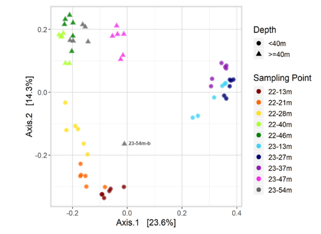 地下水質(zhì)量對(duì)飲用水生產(chǎn)至關(guān)重要,但地下水資源正日益受到農(nóng)藥污染的威脅。由于殺蟲劑經(jīng)常出現(xiàn)在微型污染地濃度下,它們對(duì)微生物來說是沒有吸引力的碳源,通常會(huì)頑固地存在。探索用于飲用水生產(chǎn)的含水層中的微生物群落,是了解地下水中微污染物命運(yùn)的重要第一步。在這項(xiàng)研究中,調(diào)查了用于飲用水生產(chǎn)的含水層中地下水地球化學(xué)、殺蟲劑脅迫和微生物群落之間的相互作用。首先,于荷蘭的兩口地下水監(jiān)測(cè)井采樣,同時(shí)在2014年、2015年和2016年進(jìn)行了采樣,并且在兩口井中,從13到54?m的五個(gè)離散深度對(duì)水進(jìn)行了采樣。為了研究上述科學(xué)問題,使用16S?rRNA基因測(cè)序和qPCR分析地球化學(xué)參數(shù)、農(nóng)藥濃度和微生物群落組成,其中,地下水地球化學(xué)在整個(gè)研究期間是穩(wěn)定的,農(nóng)藥在低濃度(μg?L-1范圍)下分布不均勻。通過計(jì)算Alpha多樣性指數(shù)PD?whole?tree,發(fā)現(xiàn)各個(gè)采樣點(diǎn)間的數(shù)據(jù)相似,但是隨著采樣點(diǎn)深度加深而變大。來自同一口井和深度的樣品緊密地組合在一起,這意味著微生物群落在時(shí)間上是穩(wěn)定的(圖2),同時(shí),所有的樣品形成三組,第一組:根據(jù)深度(來自兩口井的大于40米的樣本歸為一組);第二組和第三組:井(來自小于40米的樣本分成兩個(gè)不同的組–每口井一個(gè))分開。地球化學(xué)參數(shù)和較小程度的農(nóng)藥污染對(duì)微生物群落產(chǎn)生了選擇壓力,樣品中的微生物群落尤其受到DOC、硝酸鹽、鐵(II)和硫酸鹽豐度的影響。兩口井中的微生物群落在較深的含水層中顯示出相似的組成,在那里抽水會(huì)導(dǎo)致水平流動(dòng)。這項(xiàng)研究提供了對(duì)塑造微生物群落組成的地下水參數(shù)的深入了解。這些信息有助于未來實(shí)施修復(fù)技術(shù),以保證安全的飲用水生產(chǎn)。