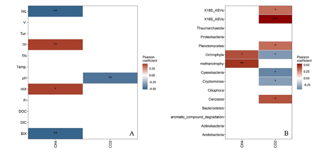 圖3生理化學(xué)變量和微生物與TGR中CO2和CH4通量之間的相關(guān)性,A組和B組分別為生理化學(xué)變量和微生物