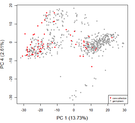 核心種質(zhì)資源(core?collection),即保存的種質(zhì)資源的一個核心子集,是采用一定方法,從保存的某一物種種質(zhì)資源中抽取的一個核心子集,以最少的遺傳資源樣本量最大限度地代表包括地理分布在內(nèi)的整個資源群體的遺傳多樣性,而未列入核心種質(zhì)的其它資源材料則作為保留樣本予以保存。因此核心種質(zhì)可以作為種質(zhì)資源群體研究和利用的切入點,從而提高整個種質(zhì)庫的管理和利用水平。