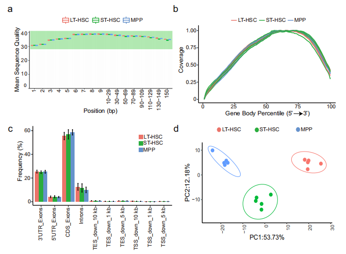 對(duì)于批量RNA測(cè)序,PCA分析顯示三種細(xì)胞類(lèi)型在PC1軸上分離,PC1的變異率為53.73%(圖3d)。與單細(xì)胞數(shù)據(jù)相似,ST-HSC位于LT-HSC和MPP之間,與它們的生物學(xué)狀態(tài)相對(duì)應(yīng)。綜上所述,這些結(jié)果表明細(xì)胞被正確分選,批量和單細(xì)胞短讀長(zhǎng)RNA-seq數(shù)據(jù)的質(zhì)量都很高。