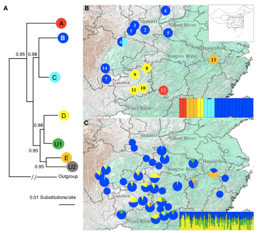 此外,2018年發(fā)表在Current Biology(IF = 10.814)的中國大鯢研究中,研究人員收集了70個(gè)野生地采集的1034個(gè)個(gè)體,通過SLAF-seq對(duì)中國大鯢的分類進(jìn)行研究。基于23,159個(gè)SNPs位點(diǎn)和mtDNA的野生采集個(gè)體的遺傳多樣性分析顯示:中國大鯢至少具有5個(gè)明顯的分群(圖3)。此外還有一些未被鑒定的種(圖3:U1,U2)。譜系A(chǔ)-E,在4.71-10.25Mya間開始分化,并與河流排水相關(guān)?;谵r(nóng)場育種的中國大鯢個(gè)體的mtDNA和微衛(wèi)星序列的遺傳多樣性分析顯示其具有廣泛的遺傳混合,特別是,漸滲種類B來自陜西黃河流域。通過農(nóng)業(yè)混種導(dǎo)致了分化于四百萬年前的中國大鯢發(fā)生了雜交,這種雜交方式不足為奇,另有研究報(bào)道過在日本本土,中國大鯢的引種和日本大鯢發(fā)生了雜交。