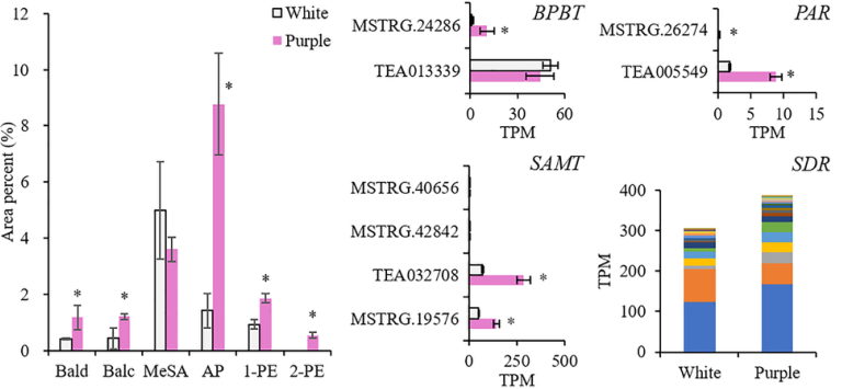 然后,作者研究了四種直接合成苯甲酸芐酯、MeSA、2-PE和AP的基因,分別是苯甲醇鄰苯甲酰轉(zhuǎn)移酶(BPBT;KO id為K19861)、水楊酸羧基甲基轉(zhuǎn)移酶(SAMT;KO id為K21483)、苯乙醛還原酶(PAR)和短鏈脫氫酶/還原酶(SDR)。他們都在紫色茶花中高表達(dá)。通過柱狀圖分析了兩個品種之間存在顯著差異的22個SDR基因成員。在紫色茶花中,22個SDR基因的總表達(dá)量高出1.3倍,其中表達(dá)水平高的成員(TEA025281)也是如此。BPBT和PAR表達(dá)水平較低,分別為15和5倍。兩個SAMT成員在茶花中高度誘導(dǎo),在紫色花瓣中高出3-4倍。這些結(jié)果證明紫茶花中揮發(fā)性BPs的生物合成能力更強。