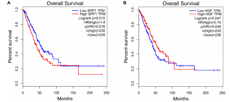 PPI網(wǎng)絡從677個共有差異mRNA中識別出597個mRNA,其中有2246條邊相互關聯(lián)(圖5)。使用cytoHubba插件MCC排名確定了前10個關鍵mRNA,包括神經(jīng)源性位點notch同源蛋白1(NOTCH1)、基質(zhì)金屬蛋白酶2(MMP2)、胰島素樣生長因子1(IGF1)、激酶插入結構域受體(KDR)、分泌磷蛋白1(SPP1)、血管內(nèi)皮生長因子受體1(FLT1)、肝細胞生長因子(HGF)、血管生成素1受體(TEK),血管生成素-1基因(ANGPT1)和血小板源性生長因子(圖6)。通過生存分析的計算,作者使用GEPIA進一步驗證了這些關鍵的mRNA。在這里,只有兩個(SPP1和HGF)被鑒定為關鍵基因,并與生存相關(圖7)。生存分析顯示,在LUAD中,SPP1的表達與生存呈負相關,而HGF與生存呈正相關(圖7)。此外,SPP1和HGF均在黏附信號通路中富集。