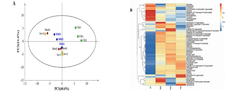 Fig 2 采用主成分分析法(A)和層次聚類分析法(B)對不同程度油斑病青檸檬的初級代謝產(chǎn)物進行分析