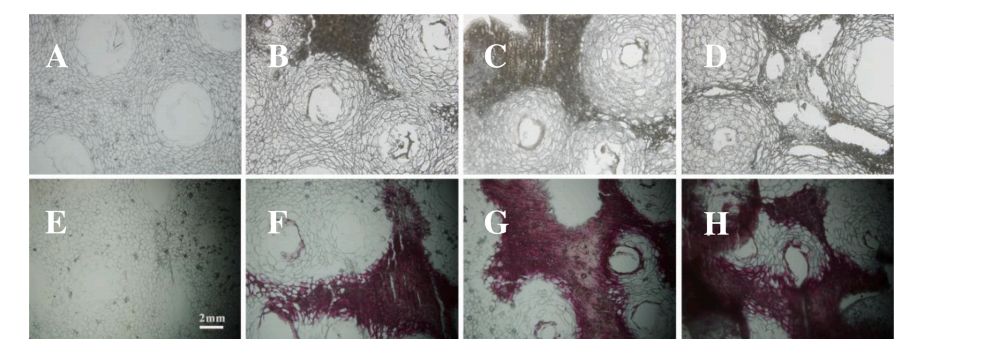為了從形態(tài)學(xué)角度揭示油斑病對檸檬皮中木質(zhì)素積累的影響,采用間苯三酚-鹽酸反應(yīng)對健康和油斑病檸檬皮的橫截面進行了木質(zhì)素化研究。在染色前,健康檸檬皮的細(xì)胞排列整齊,沒有塌陷,而輕度油斑病檸檬皮的細(xì)胞似乎塌陷并堆積在一起。隨著油斑病嚴(yán)重程度的增加,細(xì)胞的堆積越來越明顯,細(xì)胞間組織的塌陷導(dǎo)致不同程度的破裂,特別是在油斑病嚴(yán)重的檸檬皮中,可以觀察到許多裂痕洞(Fig. 4)。