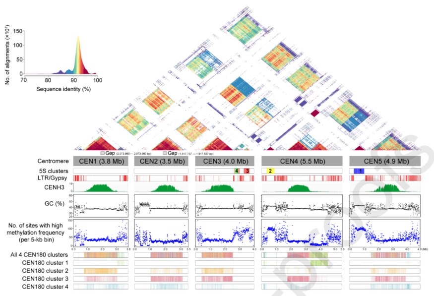 ② ?在雜合度極低的物種中,往往會(huì)追求更完美和更準(zhǔn)確的組裝,尤其是解析其上高度復(fù)雜的著絲粒位點(diǎn),植物的著絲粒位于染色體的異染色質(zhì)區(qū)域,該區(qū)域由多種類型的DNA重復(fù)元件組成,主要包括衛(wèi)星DNA序列、單一拷貝DNA、反轉(zhuǎn)錄元件、轉(zhuǎn)座子和端粒類重復(fù)序列等。人類基因組完成圖(Nurk S et al., Science.2022; Altemose N et al., Science.2022; Gershman A et al., Science.2022)、擬南芥T2T基因組(Naish M et al., Science.2021;Wang B et al., GPB.2021)等研究均說(shuō)明,對(duì)著絲粒區(qū)的甲基化等表觀調(diào)控進(jìn)行解析,具有重要的研究意義。例如,擬南芥T2T基因組研究中,作者發(fā)現(xiàn)著絲粒的DNA甲基化高于著絲粒周圍區(qū)域,但在著絲粒內(nèi)部,CENH3信號(hào)富集的CEN180高度串聯(lián)重復(fù)區(qū)域呈現(xiàn)低甲基化狀態(tài)(Wang B et al., GPB.2021)。