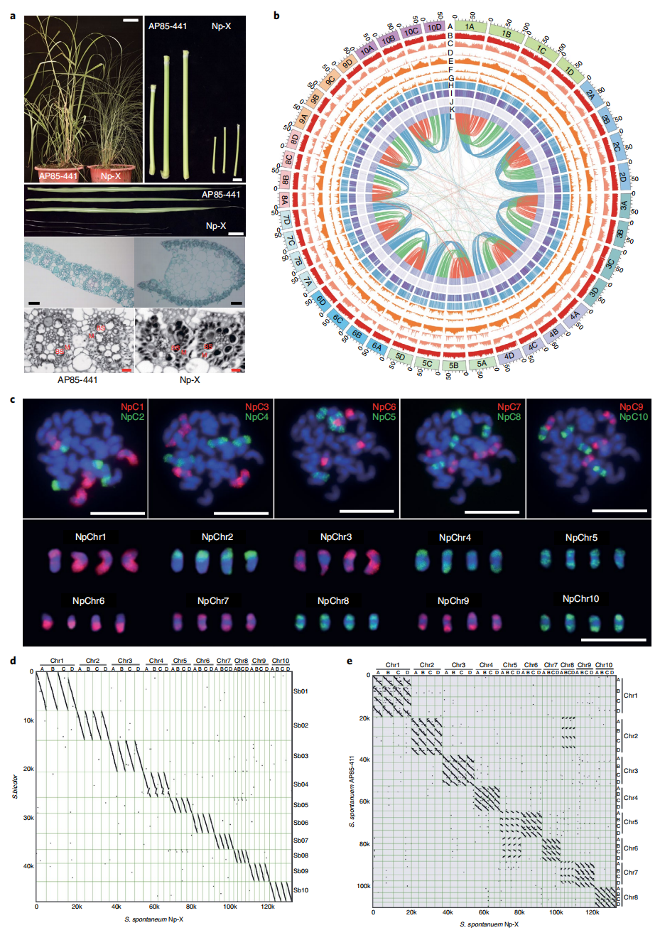 甘蔗屬是具有重要經(jīng)濟(jì)價(jià)值的作物,但其遺傳背景極其復(fù)雜,限制了甘蔗的進(jìn)一步育種改良。具有廣泛分布的甘蔗細(xì)莖野生種割手密(S. spontaneum)為現(xiàn)代栽培種甘蔗貢獻(xiàn)了抗逆、分蘗等優(yōu)良性狀,實(shí)現(xiàn)了甘蔗的育種史上大的突破。割手密倍性和染色體基數(shù)的廣泛變異是甘蔗育種重要的種質(zhì)資源,為研究植物同源多倍體基因組的進(jìn)化提供了一個(gè)良好的模型。如何將天然同源四倍體的四套同源基因組完整組裝?不同倍性與染色體基數(shù)如何演化?這都是甘蔗基因組研究有趣和重要的地方也是難以攻破之處。本次研究在構(gòu)建高質(zhì)量基因組的基礎(chǔ)上進(jìn)一步解析了甘蔗復(fù)雜的演化之路:(1)本次研究完成了割手密 Np-X(2n=4x=40)高質(zhì)量同源多倍體基因組測序,完整的組裝了10組同源染色體的共40條染色體基因組。(2)Saccharum中的一對古復(fù)制染色體NpChr5和NpChr8經(jīng)歷了分裂,隨后融合并伴隨著著絲粒分裂。重組時(shí)帶有著絲粒結(jié)構(gòu)的染色體片段融合入另外一條完整的染色體,導(dǎo)致x = 8中出現(xiàn)“雙著絲?!爆F(xiàn)象。(3)甘蔗分別在6.4 Mya和4.0 Mya時(shí)與高粱和芒草發(fā)生分化。在甘蔗中,割手密與S. officinarum在~1.6 Mya發(fā)生分化,兩個(gè)割手密材料Np-X(x=10)和AP85-441(x=8)在~0.8 Mya分化,表明AP85-441中的染色體減少是最近發(fā)生的。比較基因組結(jié)合轉(zhuǎn)錄組共同解析兩個(gè)甘蔗種“近期”獨(dú)立分化的且與糖分代謝、生物量、光合等相關(guān)的基因,為甘蔗的分子輔助育種提供重要的理論指導(dǎo)。(4)研究推斷Np-X(x=10)有可能代表祖先的核型,核型x=9和x=8可能是以逐步方式進(jìn)化而來。割手密起源于印度北部的一個(gè)x=10的祖先,然后傳播到印度次大陸、中國和東南亞的四個(gè)主要群體。在染色體減少過程中,基因組中受自然選擇區(qū)可能參與多糖代謝和脅迫耐受過程。