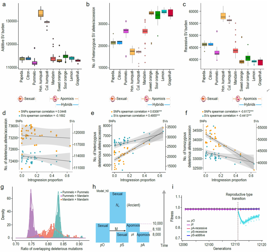 柑橘通過珠心進行無融合生殖,保留了母體基因型,這可能導致基因組中有害突變和結構變異(SVs)的積累。從234份材料中共鑒定出139,241個可靠的SVs,其中64.2%為缺失,16.6%為重復,15.5%為易位。山金柑的SV數(shù)量最高,可能與有效種群大小減少有關(圖3a)。具有無融合生殖的雜交群體的雜合有害變異約為有性生殖群體的1.45倍。隨后提出了雜種無融合生殖將SVs隱藏在雜合子狀態(tài)的假說,這可能主要是隱性選擇造成的危害。因此,有性生殖的雜種可能會迅速以隱性純合的方式暴露有害變異。這個假說解釋了為什么無融合生殖和有性生殖的天然雜交樣本中觀察到的自然雜種通常是無融合生殖的。有害突變的模式與SVs的模式一致,即與有性生殖群體相比,無融合生殖群體的隱性有害負擔較低(7.39%),雜合子SVs較多(約2.62倍)。在隱性模型下,從無融合生殖到有性生殖的生殖模式轉變導致種群適應度在轉變后立即下降13.48±0.87%,但隨后恢復(圖3i)。相比之下,保持無融合生殖的種群保持種群適合度。