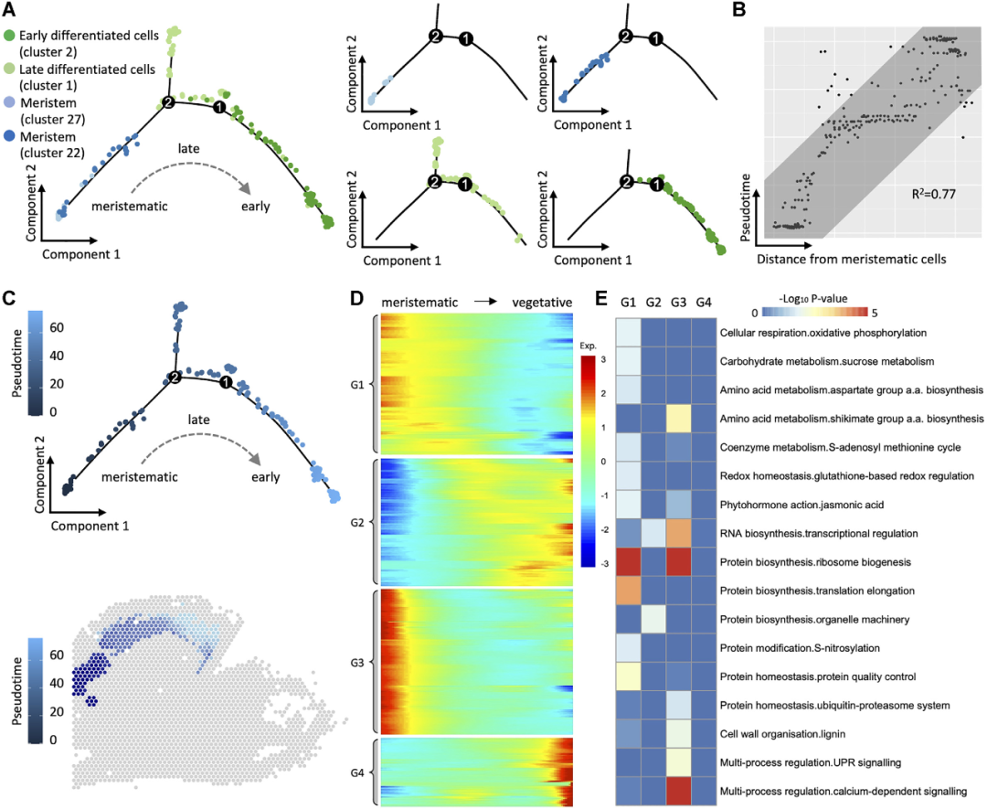 為了研究從分生組織細(xì)胞到營養(yǎng)型細(xì)胞(花被、唇瓣)和生殖細(xì)胞(花柱)的分化,研究團(tuán)隊(duì)用Monocle繪制了細(xì)胞狀態(tài)的軌跡。如圖2B所示,三簇分生組織細(xì)胞形成了一條連續(xù)的路徑,代表其發(fā)育過程,與其在組織學(xué)切片上的位置高度一致。該路徑分為兩條子路徑:一條是由花被片中的營養(yǎng)型細(xì)胞組成,另一條由花柱中的花藥原基生殖細(xì)胞組成。細(xì)胞類型變化的軌跡作為動態(tài)發(fā)育過程的靜態(tài)投影,也可以理解為分生組織細(xì)胞的擬時(shí)序分化。如圖2C所示,此時(shí)營養(yǎng)型細(xì)胞出現(xiàn)較早,并分散在子路徑的遠(yuǎn)端。共鑒定出4,685個(gè)空間差異基因與發(fā)育擬時(shí)間相關(guān),對這些基因繪制分支軌跡基因表達(dá)熱圖,發(fā)現(xiàn)它們隨著發(fā)育路徑的分離表現(xiàn)出不同的表達(dá)模式(圖2D)。MapMan功能富集圖顯示它們主要富集在細(xì)胞壁代謝、激素、脂質(zhì)、蛋白質(zhì)和RNA合成等功能上(圖2E)。通過基因的擬時(shí)分布圖發(fā)現(xiàn)許多其他基因可能在分生組織、營養(yǎng)組織和生殖組織的細(xì)胞分化過程中發(fā)揮作用(圖2F)。