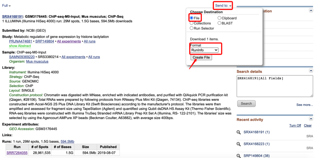 然后點擊最下方SRA編號,進(jìn)入下面的頁面這里面包含了這個樣本的基本信息,包括測序平臺、文庫類型、數(shù)據(jù)量等基本信息,然后點擊頁面右上方的Send to按鈕,選擇File,F(xiàn)ormat選擇RunInfo,然后點擊Creat file下載一個csv文件,打開文件,可以看到一個下載鏈接