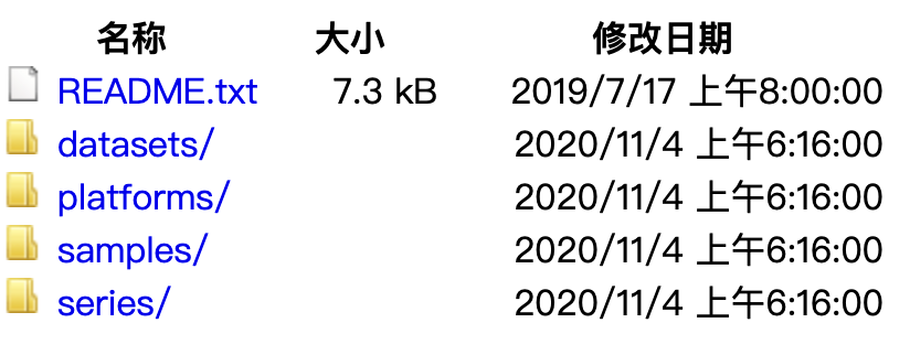 d)?GEO Dataset (GDS) 數(shù)據(jù)集的ID號這些數(shù)據(jù)均可以在ftp(ftp://ftp-trace.ncbi.nih.gov/geo/)進(jìn)行下載。一般我們在文章中看到的都是GSE的ID,那我們?nèi)绾瓮ㄟ^GSE的ID進(jìn)行數(shù)據(jù)的下載呢,下面就讓小編手把手教您如何進(jìn)行GEO數(shù)據(jù)的下載。