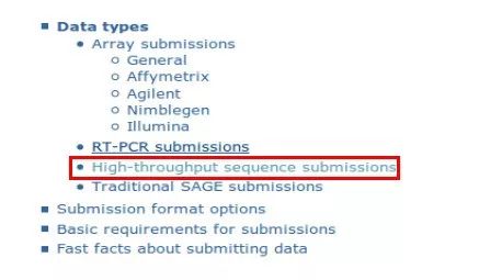 GEO數(shù)據(jù)庫支持上傳芯片數(shù)據(jù)、高通量數(shù)據(jù)以及RT-PCR數(shù)據(jù)等,首先選擇需要上傳數(shù)據(jù)的類型,接下來以high-throughput sequence submisssions (高通量測(cè)序)為例進(jìn)行詳解。