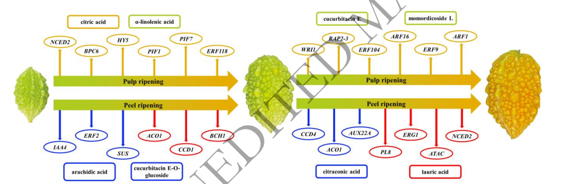 ?為了更全面地了解‘金鈴子’果實(shí)的發(fā)育成熟過(guò)程,作者對(duì)‘金鈴子’果實(shí)三個(gè)不同生長(zhǎng)發(fā)育期的轉(zhuǎn)錄組和代謝組進(jìn)行了系統(tǒng)分析。在果實(shí)生長(zhǎng)發(fā)育前期,共鑒定出515個(gè)差異基因和216個(gè)差異代謝物,在果實(shí)生長(zhǎng)發(fā)育后期,鑒定出4593個(gè)差異基因和376個(gè)差異代謝物,這些差異基因和差異代謝物參與調(diào)控‘金鈴子’果實(shí)生長(zhǎng)發(fā)育過(guò)程中葫蘆素、皂苷、植物激素、氨基酸、脂類(lèi)、類(lèi)胡蘿卜素等的生物合成和代謝過(guò)程。這些差異決定了‘金鈴子’果實(shí)的品質(zhì)、營(yíng)養(yǎng)價(jià)值以及果皮顏色的變化,為苦瓜基因組研究提供了一個(gè)新的遺傳資源。