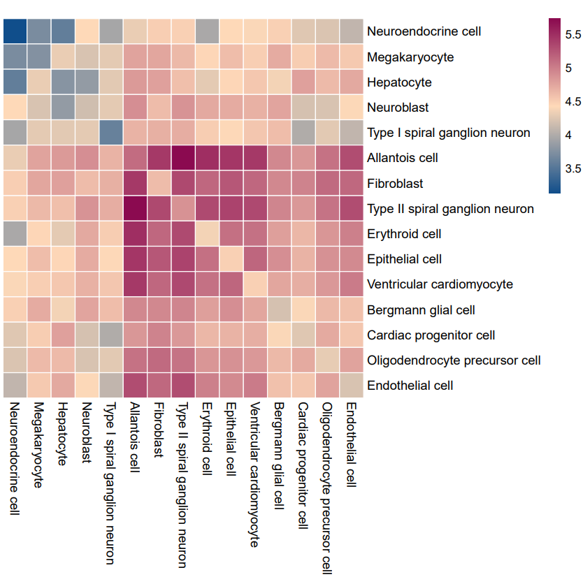 注:橫縱坐標表示細胞類型,顏色深藍色到紫紅色代表互作數(shù)由低到高
