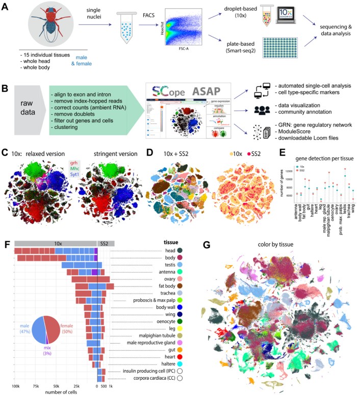 實(shí)驗(yàn)方法:解剖了來(lái)自雌性和雄性黑腹果蠅的12個(gè)組織(觸角、體壁、脂肪體、平衡棒、心臟、腸道、腿、馬氏管、絳色細(xì)胞、喙和下顎須、氣管、翅膀)以及3個(gè)性別特異性組織(雄性生殖腺、睪丸、卵巢)。對(duì)于遍布全身的組織使用特異性GAL4驅(qū)動(dòng)核-GFP蛋白,再用流式細(xì)胞熒光分選技術(shù)標(biāo)記和收集細(xì)胞核,進(jìn)行單細(xì)胞核snRNA-seq