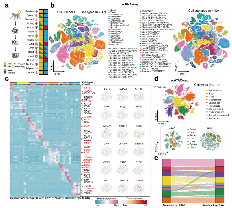 該研究對(duì)成年食蟹猴的16個(gè)代表性器官進(jìn)行單細(xì)胞轉(zhuǎn)錄組測(cè)序和單細(xì)胞染色質(zhì)開(kāi)放性測(cè)序,構(gòu)建了食蟹猴多器官的單細(xì)胞多組學(xué)參考圖譜,將25萬(wàn)個(gè)細(xì)胞進(jìn)行 t-SNE降維聚類(lèi)得到40余種不同的細(xì)胞亞群。