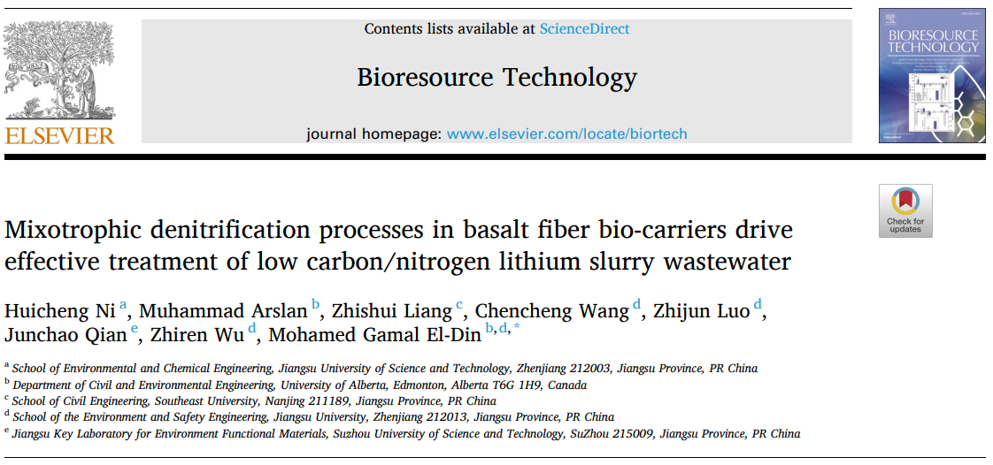 研究內(nèi)容:通過在生物接觸氧化反應器中使用玄武巖纖維(BF)生物載體,成功處理了鋰電池漿液廢水。結果顯示在12小時的HRT和0-1mg/L的溶解氧(DO)下,COD(93.3±0.5 %)和總氮(77.4±1.0 %)明顯減少。改進后的Stover-Kincannon模型表明,R-BF的總脫氮率為4.462 kg/m3/d,而Monod模型中的底物最大比反應速率(qmax)為0.323 mg-N/mgVSS/d。在生物巢內(nèi)建立了穩(wěn)定的內(nèi)部環(huán)境。微生物分類學分析顯示存在反硝化脫碳菌、異養(yǎng)硝化-好氧反硝化聯(lián)合菌、亞硝酸鹽氧化菌和氨氧化菌。功能分析顯示R-BF中與(有氧)化能異養(yǎng)、氮呼吸、硝酸鹽還原、亞硝酸鹽呼吸/反硝化和硝酸鹽相關的變化。該研究提出了一種在低C/N條件下實現(xiàn)鋰漿廢水處理的反硝化的新方法。