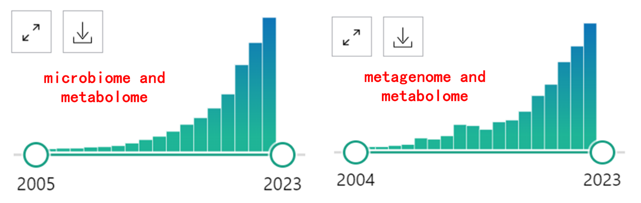 而近年來(lái),關(guān)鍵詞“microbiome and metabolome”、“metagenome and metabolome”也是逐漸備受關(guān)注的熱點(diǎn)話題,PubMed搜索發(fā)文量也是逐年上升的趨勢(shì)。